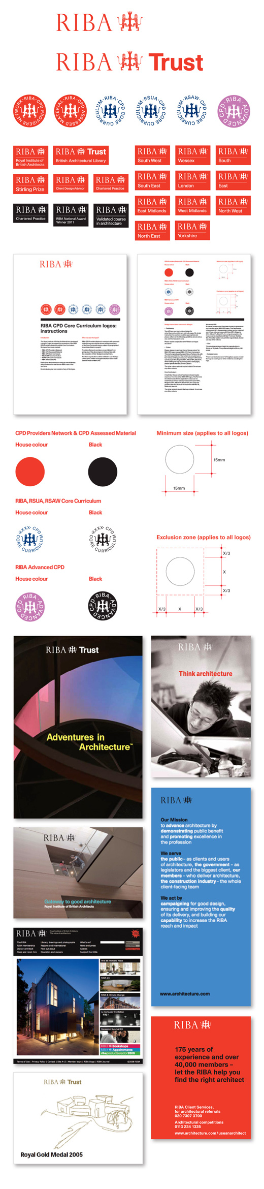 The logo system refers to the different arms of the Institute (RIBA, RIBA Trust, RIBA Enterprises etc.), its services (British Architectural Library, Client Design Advisor etc.) and the different regions (East, West Midlands etc.)